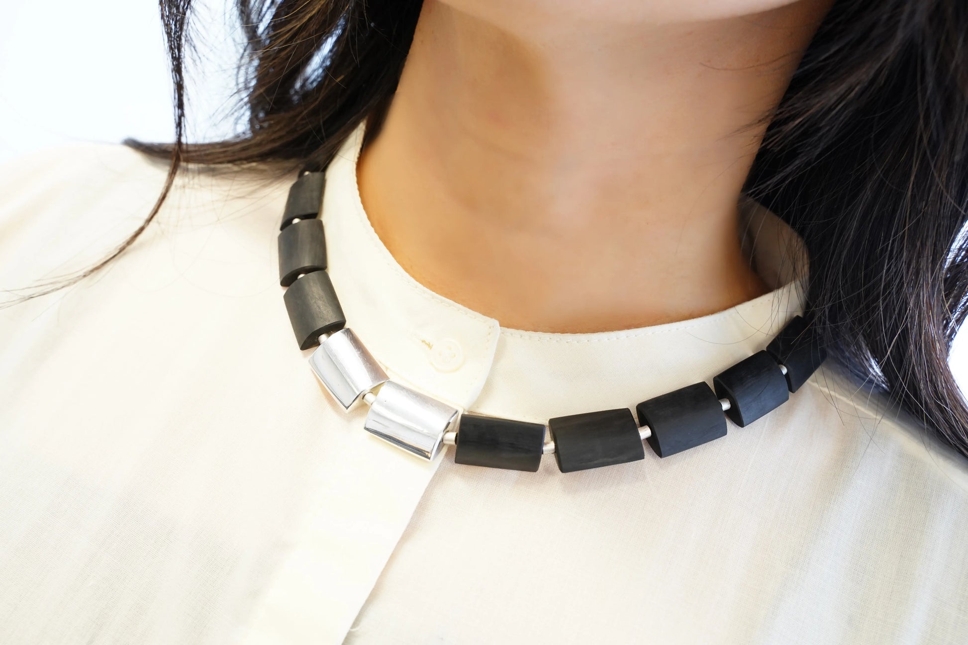 ネックレスとイヤリングには、アルミニウムで加工されたビーズ (古いエンジン部品からリサイクルされ、光沢のある研磨済み)、ペーパービーズ (リサイクルされた雑誌等)、手加工のガラス (リサイクル)、手加工のセラミック、綿紐 (T シャツからリサイクル) が含まれます。